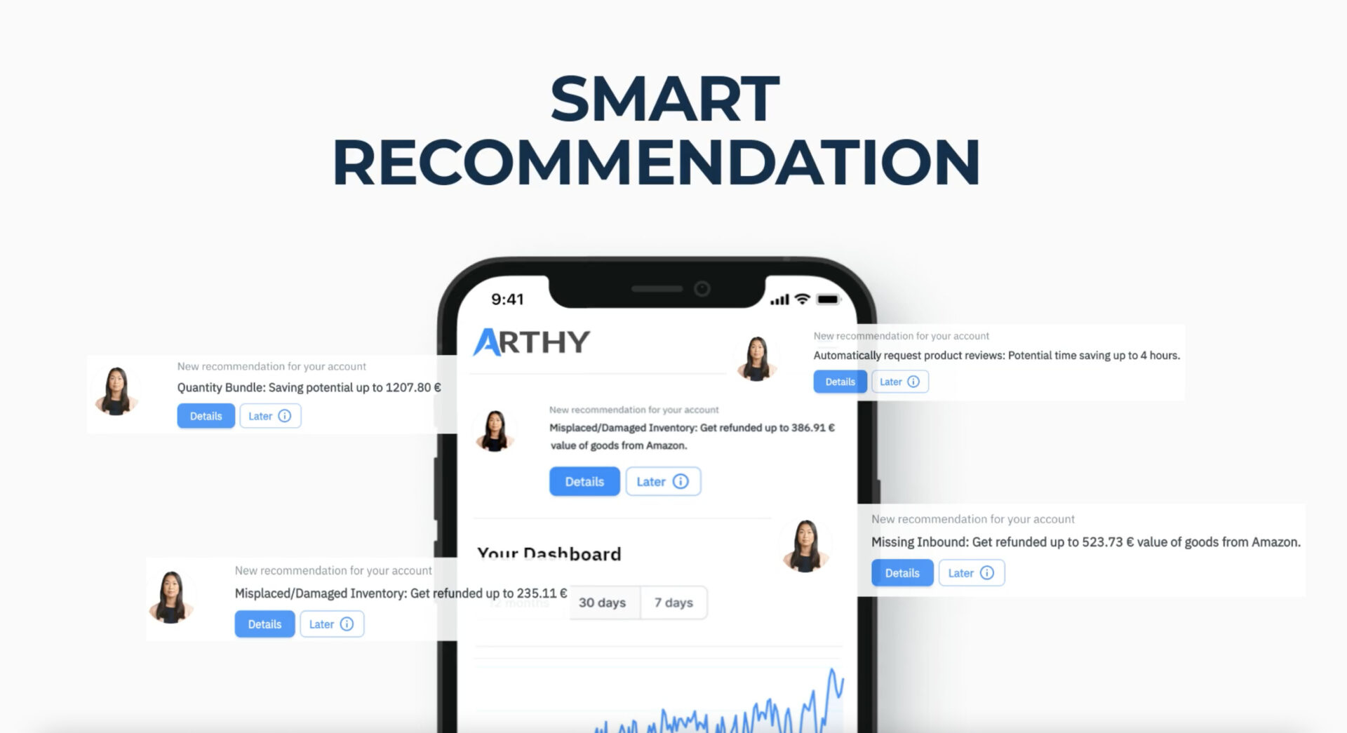 Arthy ist wie der Mitarbeiter, den jeder sich wünscht, zu einem unglaublich effektiven Gehalt. Die Vision von Arthy ist, dass sie eines Tages das Zentrum deines E-commerce Universums ist und dir PROAKTIV jegliche operativen, mühsamen Aufgaben abnimmt, während du dich auf deine Core-Business fokussierst.