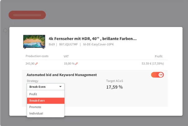 Sie geben in unserem Tool einen Zielwert für die Optimierung an – Advertising Cost of Sale (ACoS) oder monatliches Budget – und das Tool holt dann das Beste aus Ihren Kampagnen heraus und optimiert sie auf Grundlage des angegebenen Zielwertes.