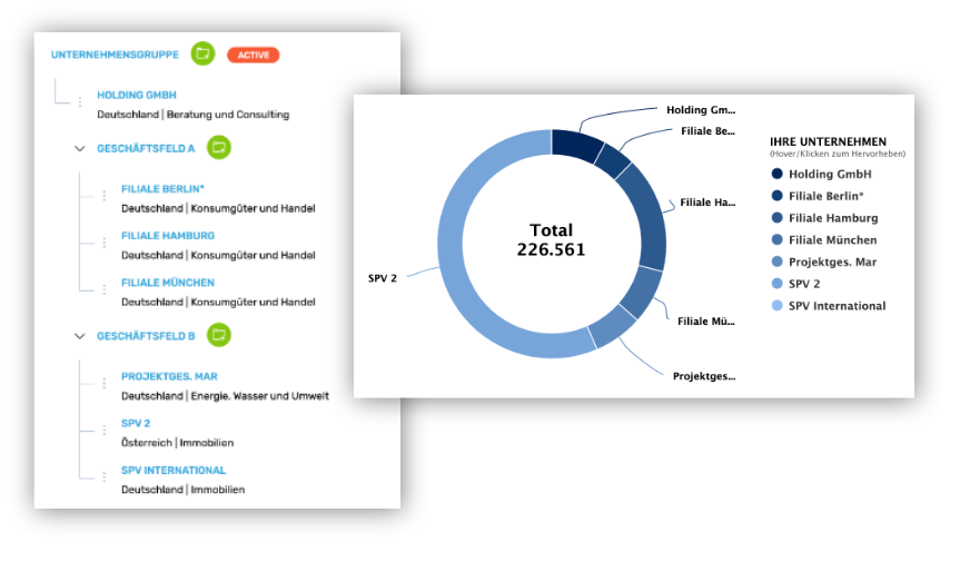 Bilden Sie Ihre Unternehmensstruktur mit wenigen Klicks ab und fügen Sie zu den einzelnen Unternehmen Ihre Teams mit den erforderlichen Berechtigungen hinzu. Erhalten Sie einen immer aktuellen Überblick über alle Banken und Bankkonten sowie die Liquiditätsentwicklung all Ihrer Unternehmen.