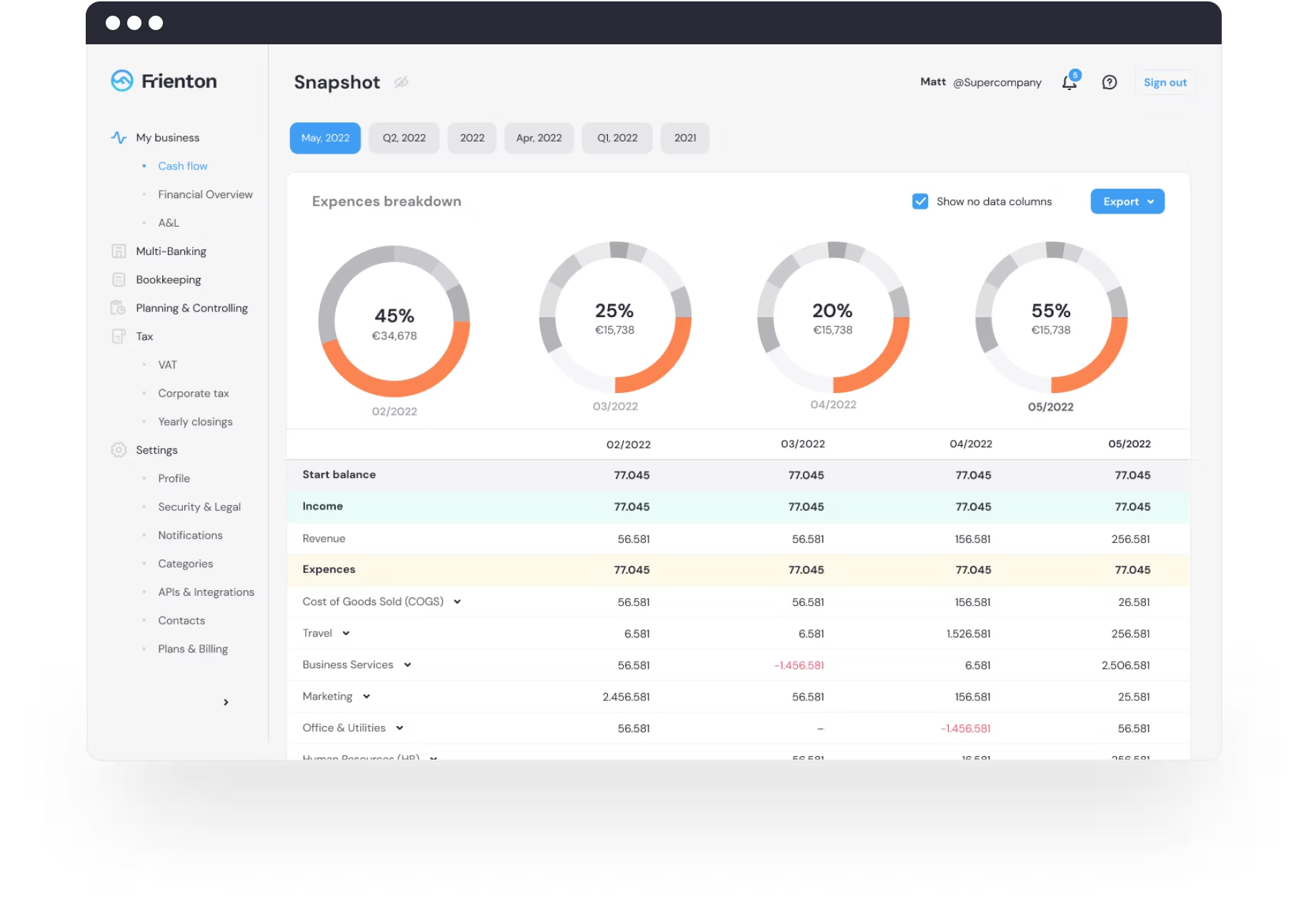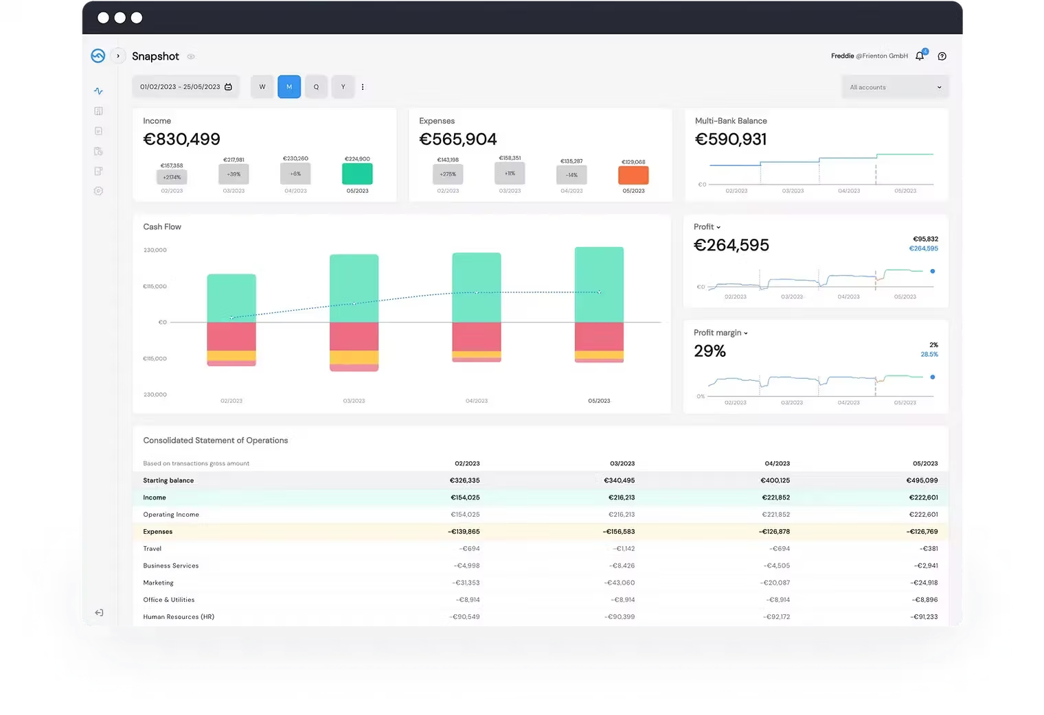 Salden & Transaktionen sämtlicher Geschäftskonten, Kreditkarten, Zahlungsdienstleistern wie PayPal oder Stripe & E-Commerce-Anbietern wie Amazon oder Shopify auf einen Blick ergänzt um smarte Online-Banking-Funktionen inkl. One-Click-Payments, Sammelzahlungen & Einrichtung von Daueraufträgen direkt auf der Frienton Plattform – alles an einem Platz, perfekt integriert.