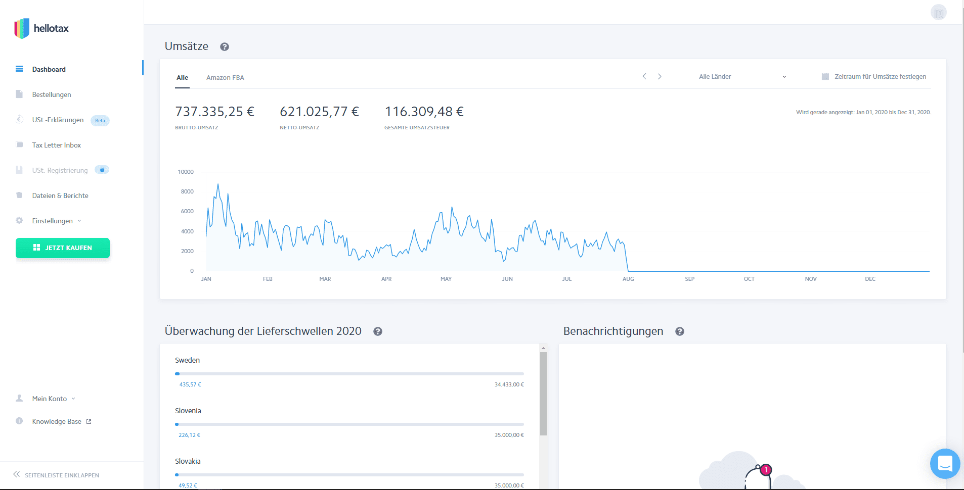 hellotax automatisiert die Registrierung, Berechnung, Meldung und Einreichungen der Umsatzsteuer für Onlinehändler in Europa. Das intern entwickelte kostenlose Steuer-Tool beinhaltet eine Vielzahl nützlicher Features, wie die Überwachung der Umsatzsteuer-Lieferschwellen, Berichte für verschiedene Verkaufskanäle und Zeiträume, Integrationen mit Amazon und anderen Plattformen und vieles mehr. Darüber hinaus kann ein Premium-Service zur Einhaltung der Umsatzsteuervorgaben in Anspruch genommen werden, der Online-Umsatzsteuerregistrierungen und -Erklärungen und die sichere Aufbewahrung aller Steuerbriefe + Übersetzungen selbiger beinhaltet. Dieser Extraservice kann bequem auf monatlicher oder jährlicher Basis gebucht werden. Außerdem verfügt hellotax über ein Netzwerk hauseigener Steuerberater, die über ganz Europa verteilt sind. Sie garantieren höchste Qualitätsstandards, eine reibungslose Kommunikation mit den Behörden und die Einhaltung aller steuerlichen Vorgaben und Regelungen.