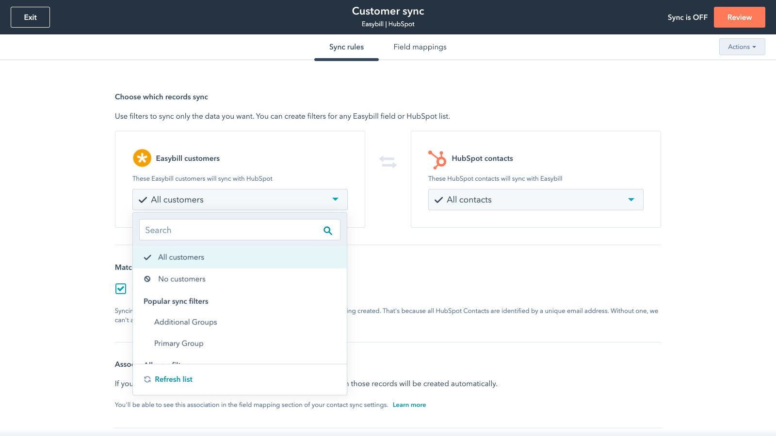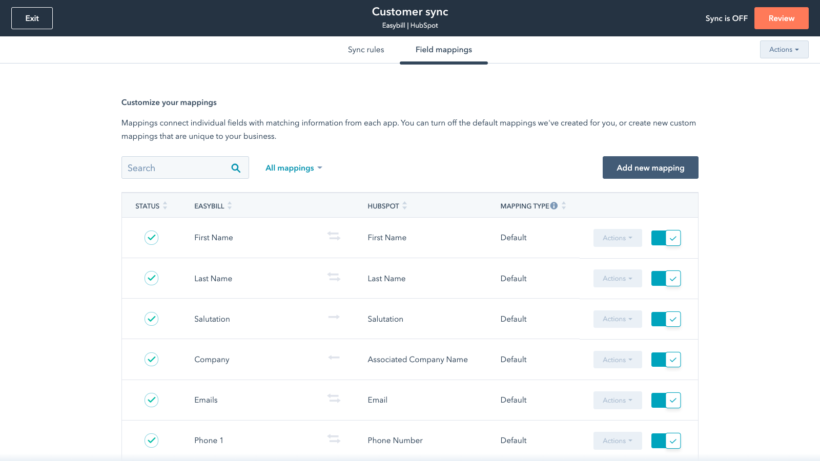 Die HubSpot-CRM-Plattform ist eine umfassende Software-Suite, die entwickelt wurde, um diesen Inbound-Ansatz zu unterstützen, damit du – und deine Kunden – besser wachsen können. Die Datensynchronisation von HubSpot ermöglicht es dir, easybill und HubSpot für eine bidirektionale Echtzeit-Synchronisation von Kundeninformationen zu verbinden, sodass du dich nicht mit unsauberen, zeitaufwendigen Importen beschäftigen musst. Jedes Mal, wenn du einen Kontakt in easybill hinzufügst oder aktualisierst, wird dieser automatisch mit HubSpot synchronisiert und umgekehrt.