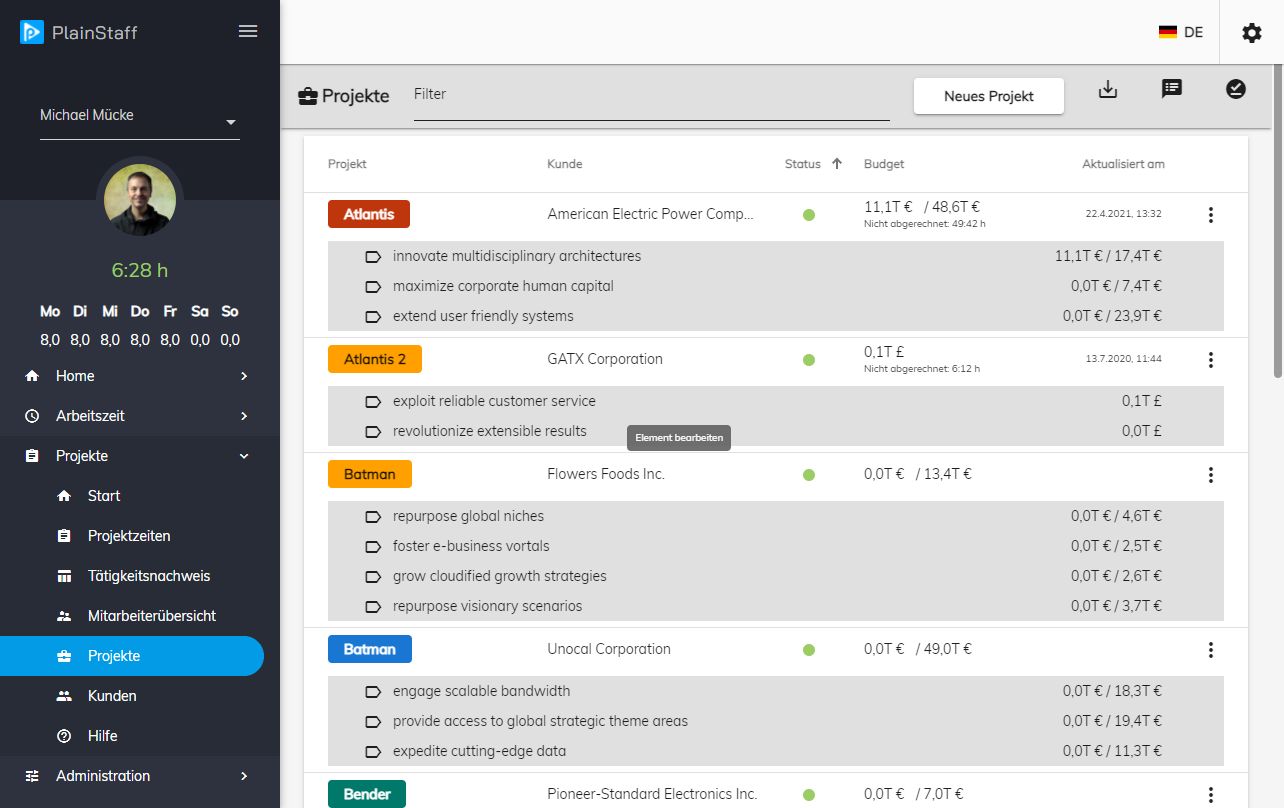 Alle Projekte im Blick: Ein Blick genügt und jeder Beteiligte weiß wie viel Projektbudget noch übrig ist und wie viele Stunden noch nicht abgerechnet wurden.