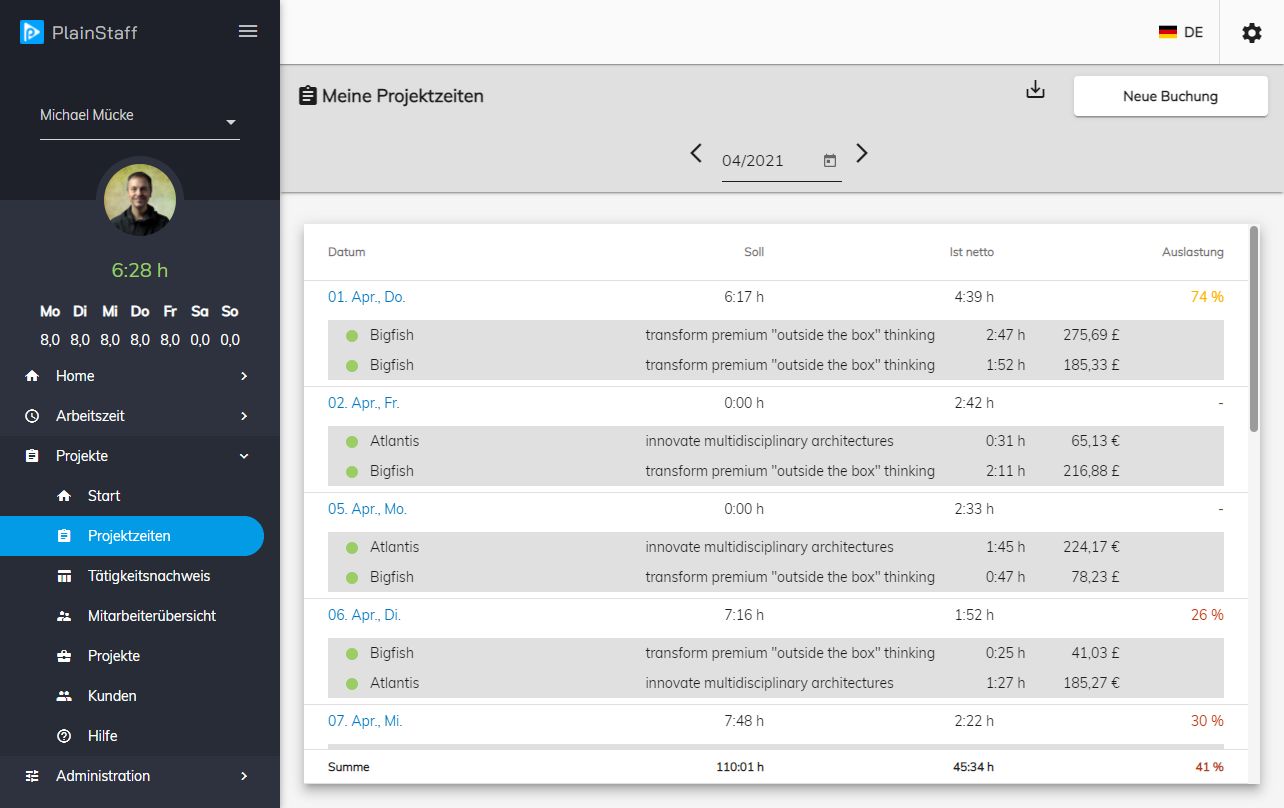 Schnelle und übersichtliche Erfassung der Projektzeiten durch die Mitarbeiter am PC oder via Smartphone.